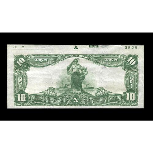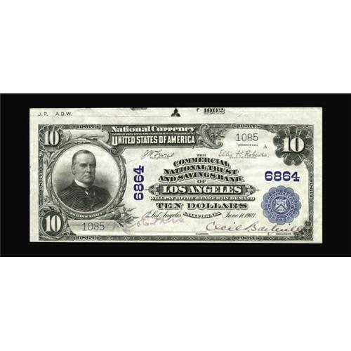 <B>Los Angeles, CA</B></I> - $10 1902 Plain Back Fr. 624 <B>The Commercial National Trust & Savings Bank</B></I> Ch. # 6864<BR>This note comes on the heels of a discovery piece which appeared in our FUN 2005 sale and sold for $11,500. Both notes bear the signature of Hollywood legend Cecil B. deMille as V. President. This is far more than a celebrity autograph on a National Bank Note, or a stunt created by deMille's publicity department, as Mr. deMille signed this note while serving as Chairman and vice-President of motion picture loans for this bank, a position he held in addition to his duties as an officer, producer and director at Paramount Pictures. In addition to his work at Paramount and his career in banking, deMille founded the Mercury Aviation Company, one of the pioneering outfits in the commercial aviation business.<BR>DeMille was born in 1881, the son of Henry deMille, a preacher and playwright who also taught English at Columbia University, and Beatrice deMille, who also was a playwright. His father died when deMille was twelve, and Beatrice supported the family by operating a school for girls as well as a theater troupe. DeMille made his stage debut in 1900, and for the next twelve years he worked as an actor in and co-manager of his mother's theater company. In 1913, after viewing the movie "The Great Train Robbery" with his friend, Jesse L. Lasky, the pair became convinced that films had a future, and resolved to establish a film production company. Joining forces with Samuel Goldwyn (then named Samuel Goldfish), they formed the company that eventually became Paramount Pictures. DeMille's career as a producer and director continued until his passing in 1959. He is best remembered for his epic "The Ten Commandments," filmed in 1956, "The Greatest Show on Earth," made in 1956, and his 1934 version of "Cleopatra." His total body of work includes over 80 films he produced,