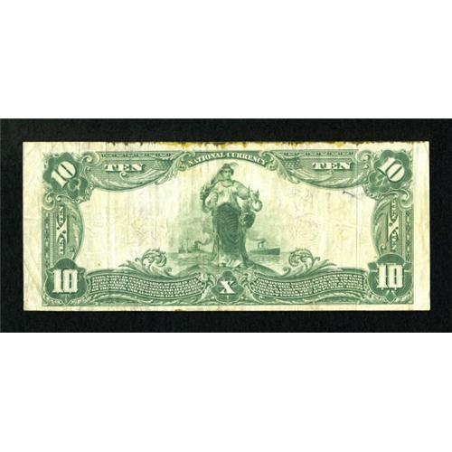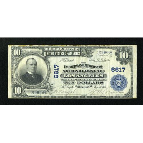 <B>Los Angeles, CA</B></I> - $10 1902 Plain Back Fr. 624 <B>The Farmers & Merchants NB</B></I> Ch. # 6617<BR> This large banking institution in LA issued more than $29 million in National Currency. While this note appears to be a bright <B>Very Fine</B></I> with decent printed signatures, repairs have been made in an attempt to fix some damage in the top margin.<BR><BR><b>Shipping:</b> Coins & Currency (<a target="_blank" href="http://www.heritageauctions.com/common/shipping.php">view shipping information</a>)