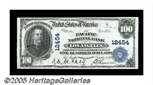 <B>Los Angeles, CA</B></I> - $100 1902 Plain Back Fr. 707 <B>The Pacific NB</B></I> Ch. # 12454<BR>This was part of the Great Western Collection before it was acquired by Jim O'Neal at that sale five years ago. It was described by Lyn Knight as follows, "This is a very special note in beautiful condition. These notes, from this bank, walked into Superior Stamp & Coin, when they were on Seventh Street in downtown Los Angeles, in the summer of 1971. Among other things, nine of these $100's were sold barely over face value. The seller at the time was Mr. Smith's widow. [E.M. Smith signed these notes as President of this bank.] Several ended up in Los Angeles collectors' hands, but others, like this one, were gradually sold over the years. . . .A super note that is worth a bit more than the type." We've had the privilege of handling several of these notes, both fifties and hundreds, over the years, but this piece is in a class by itself. It is pristine, with extraordinary centering on both front and back, and utterly original and unmolested. The paper, signatures and embossing are perfection itself, and this may well be the nicest example of its type we've ever seen. It realized $15,950 (against a $10,000-15,000 pre-sale estimate) when Jim purchased it five years ago (when an ordinary $100 in Gem was barely worth $3,000), and is certainly worth more today. Just how much more will be determined this evening, but it would not surprise us at all to see this <B>Superb Gem Crisp Uncirculated</B></I> specimen exceed our likely conservative estimate of ...