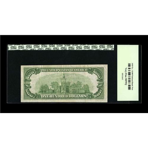 <B>Los Angeles, CA</B></I> - $100 1929 Ty. 1 <B>The Security-First NB</B></I> Ch. # 2491<BR>This nice mid-grade example is from one of the three banks to issue the $100 denomination in the 1929 series from Los Angeles. <B>PCGS Very Fine 30PPQ.</B></I>