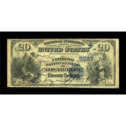 <B>Los Angeles, CA</B></I> - $20 1882 Value Back Fr. 581 <B>The Citizens NB</B></I> Ch. # (P)5927<BR> An evenly circulated and problem free piece which is one of only four $20 Value Backs reported from the bank and one of only about 15 such examples reported from the entire state. <B>Very Good-Fine</B></I>, with good margins and signatures for the type.<BR><BR><b>Shipping:</b> Coins & Currency (<a target="_blank" href="http://www.heritageauctions.com/common/shipping.php">view shipping information</a>)