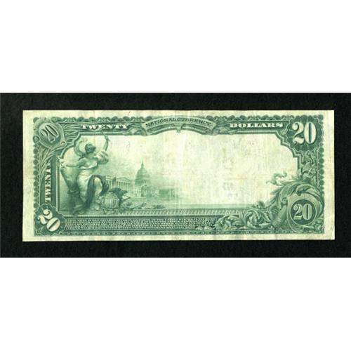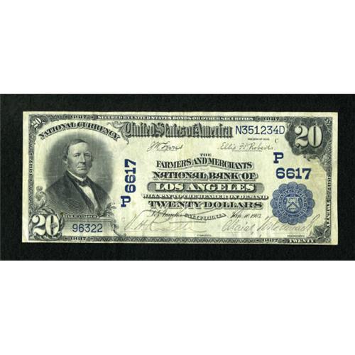 <B>Los Angeles, CA</B></I> - $20 1902 Plain Back Fr. 650 <B>The Farmers & Merchants NB</B></I> Ch. # (P)6617<BR> This moderately circulated <B>Very Fine</B></I> Blue Seal still carries decent signatures. From one of the larger LA banks, the note bears an attractive occupational title.<BR><BR><b>Shipping:</b> Coins & Currency (<a target="_blank" href="http://www.heritageauctions.com/common/shipping.php">view shipping information</a>)