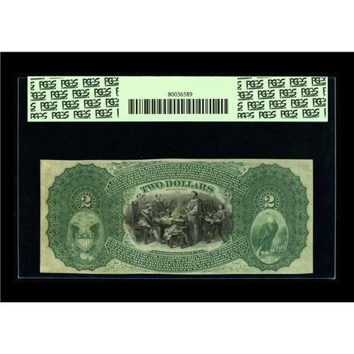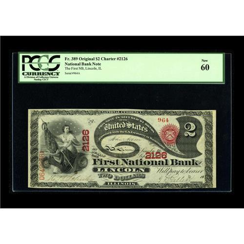 <B>Lincoln, IL</B></I> - $2 1873 Plain Back Fr. 389 <B>The First NB</B></I> Ch. # 2126<BR>A Lazy Two certified as <B>PCGS New 60,</B></I> a grade that likely would have been higher but for minor centering issues. This is one of a tiny handful of banks where a foresighted officer put back a supply of these early and now sought after notes in the highest grades, to the delight of today's quality conscious collecting community. As the universe of collectors seeking these early notes in the highest quality range has expanded substantially over the past decade, prices have experienced seemingly unstoppable upward pressure, a situation we reasonably expect will continue and likely accelerate. Plan on bidding accordingly for this attractive example that will enhance the standing of whatever collection it enters when the hammer falls tonight. The consequence of timidity for the underbidder will likely be to pay even more when a note of this quality from here is again available.<BR><BR><b>Shipping:</b> Coin/Currency (<a target="_blank" href="http://www.heritageauctions.com/common/shipping.php">view shipping information</a>)