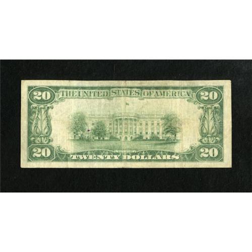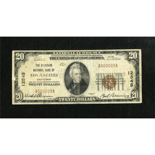<B>Los Angeles, CA</B></I> - $20 1929 Ty. 1 <B>The Seaboard NB</B></I> Ch. # 12545<BR> This piece is well circulated with a skin mark, thought it bears the appealing serial number 9. A total of 36,574 Type 1 $5s were printed for this bank. <B>Very Good.</B></I><BR><I>From The Walla Walla Collection</B></I><BR><BR><b>Shipping:</b> Coins & Currency (<a target="_blank" href="http://www.heritageauctions.com/common/shipping.php">view shipping information</a>)