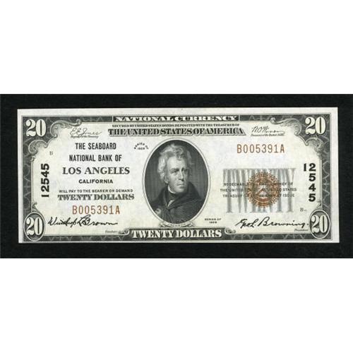 <B>Los Angeles, CA</B></I> - $20 1929 Ty. 1 <B>The Seaboard NB</B></I> Ch. # 12545<BR> Bright paper and dark inks are highlights of this $20. <B>About Uncirculated</B></I>.<BR><BR><b>Shipping:</b> Coins & Currency (<a target="_blank" href="http://www.heritageauctions.com/common/shipping.php">view shipping information</a>)