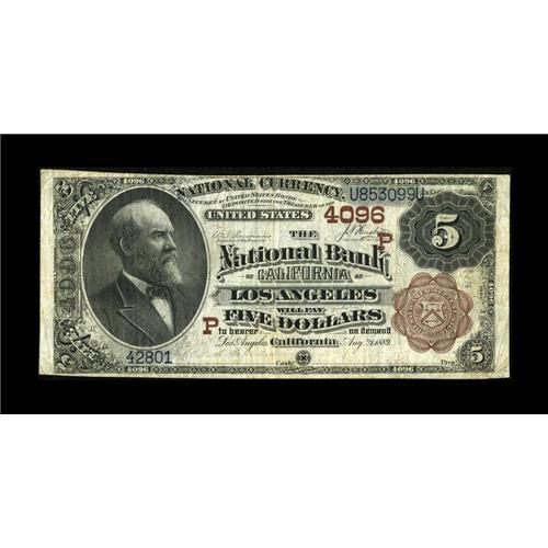 <B>Los Angeles, CA</B></I> - $5 1882 Brown Back Fr. 471 <B>The NB of California</B></I> Ch. # (P)4096<BR>This is a bright $5 Brown Back for the grade that also sports sound edges. <B>Fine.</B></I><BR><BR><b>Shipping:</b> Coins & Currency (<a target="_blank" href="http://www.heritageauctions.com/common/shipping.php">view shipping information</a>)