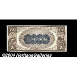 Los Angeles, CA - $5 1882 Brown Back Fr. 471 The NB of California Ch. # (P)4096This note is an old friend, having been a part of a cut sheet of these marvelous $5 Brown Backs we sold ten years ago. Each note was a drop-dead perfect gem, utterly original, meticulously margined, and with the crackling fresh paper quality and sparkling colors of a note that had been pulled from the press the morning we sold it. In the ten years since we have only had the opportunity to reoffer one of the four examples, all of which had quickly disappeared into the hands of collectors who demanded the ultimate in quality. If that describes your collecting preference, we urge you to examine this note before the sale, as once you have seen it you will be satisfied with no less than perfection. Gem Crisp Uncirculated, a superb specimen fit for the very finest of collections. <BR><BR><B>Important notice:</B> Heritage usually auctions material at the rate of 200-250 lots per hour. On some occasions eBay Live bid software or the Internet may not be able to keep up with the pace of the auction. We recommend placing a realistic absentee bid now as insurance to avoid disappointment. Occasionally the auctioneer may eliminate or reject an eBay Live bid, and the auctioneer may also reopen a lot after the close of the eBay live bidding (usually because we missed an audience bid), and may reject your bid even if it shows you as the winning bidder. By bidding via eBay Live, you agree that Heritage may award the lot to another bidder at its sole discretion under the circumstances described above or any other reasonable circumstances. Since eBay bids are not shown to us until we open the lot on the floor, we treat those bids just like floor bids. In most cases the floor responds before the eBay bid is presented to us, due to Internet lag time, so for consistency we have made it a policy that floor bids are always considered first over tie eBay live bids. Also please note that all Heritage lots purchased through eBay Live carry a 20% Buyer's Premium. Please make sure you read the Terms and Conditions before you bid. <BR><BR><B>IMPORTANT ANNOUNCEMENT ABOUT RESERVES:</B> Heritage now divulges all reserves on its web site 7 days before every auction. If you want to know whether the reserve on this lot has been met, and if not, what the reserve amount is, please visit this lot page on the HeritageCoin.com web site, or email: bid@HeritageGalleries.com