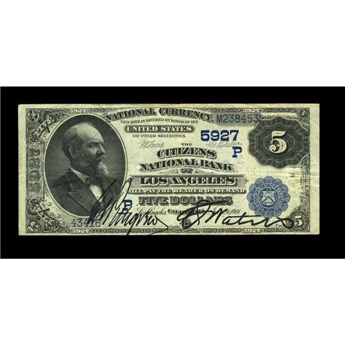 <B>Los Angeles, CA</B></I> - $5 1882 Date Back Fr. 537 <B>The Citizens NB</B></I> Ch. # (P)5927<BR>A nice note which is considerably higher grade than most of the early examples we've seen from here. Bright <B>Fine-Very Fine,</B></I> with bold black vanity signatures.