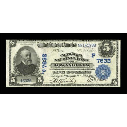 <B>Los Angeles, CA</B></I> - $5 1902 Plain Back Fr. 598 <B>The United States NB</B></I> Ch. # (P)7632<BR> This is a pleasing and original example of a popular forbidden title. Some pinholes are noted, but do not detract from the vivid paper and blue overprint. <B>Very Fine.</B></I><BR><BR><b>Shipping:</b> Coins & Currency (<a target="_blank" href="http://www.heritageauctions.com/common/shipping.php">view shipping information</a>)
