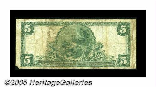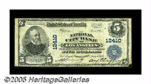 <B>Los Angeles, CA</B></I> - $5 1902 Plain Back Fr. 609 <B>The National City Bank</B></I> Ch. # 12410<BR>This short-lived bank was in business for only five years, from 1923 until 1928. It issued only the 1902 Plain Backs. <B>Fine,</B></I> with a missing lower right corner tip and darkly stamped officers' signatures.