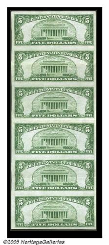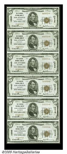 <B>Los Angeles, CA</B></I> - $5 1929 Ty. 1 <B>The Seaboard NB</B></I> Ch. # 12545 Uncut Sheet<BR>This is one of only three sheets extant from here, which represent the sum total of all of the sheets known from every Los Angeles bank combined. It's virtually identical to the other two, with a fold in the center and light folds through the second and fifth notes. The remaining notes are Uncirculated. Expect this attractive and very scarce <B>About Uncirculated</B></I> all serial number 4 sheet to reach or exceed...