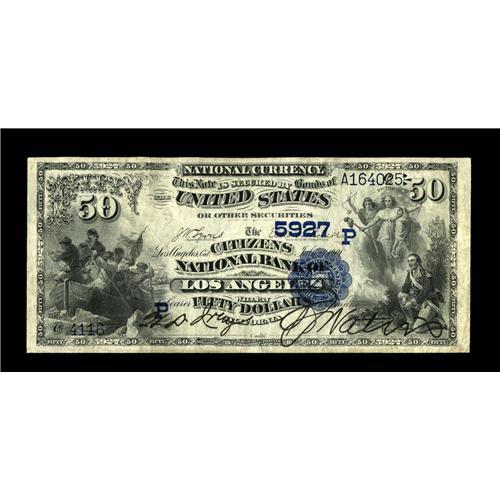<B>Los Angeles, CA</B></I> - $50 1882 Date Back Fr. 563 <B>The Citizens NB</B></I> Ch. # (P)5927<BR>This is a very scarce type whether from California or any other state. The census of known $50 1882 Date Backs totals only about two dozen pieces for the entire state of California, with this example both new to that listing and higher in grade than any of the previously reported pieces. <B>Very Fine,</B></I> with bold black signatures.<BR><I>From The Bill and Kathy Stella Currency Collection</B></I><BR><BR><b>Shipping:</b> Coin/Currency (<a target="_blank" href="http://www.heritageauctions.com/common/shipping.php">view shipping information</a>)