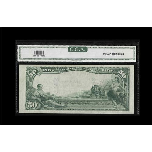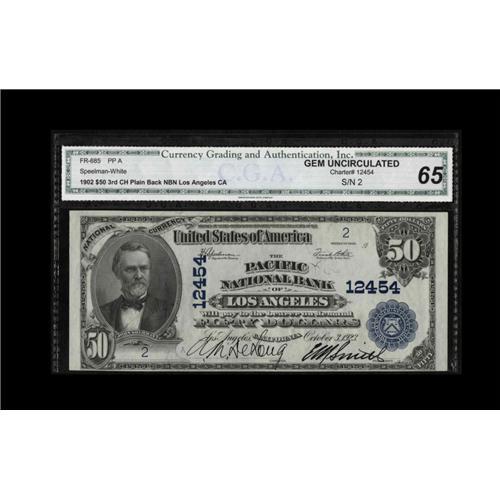 <B>Los Angeles, CA</B></I> - $50 1902 Plain Back Fr. 685 <B>The Pacific NB</B></I> Ch. # 12454<BR>A lovely example with vibrant colors, bold pen signatures, and low serial number 2, an unbeatable combination on any note, let alone a $50 Third Charter. It's been encapsulated and graded as <B>CGA Gem Uncirculated 65.</B></I>