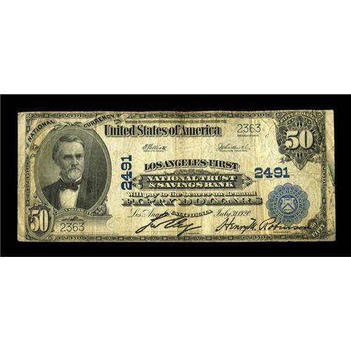 <B>Los Angeles, CA</B></I> - $50 1902 Plain Back Fr. 683 <B>Los Angeles-First National Trust & Savings Bank</B></I> Ch. # 2491<BR>The edges are nice for the grade, while the signatures are darkly printed. <B>Very Good.</B></I><BR><BR><b>Shipping:</b> Coins & Currency (<a target="_blank" href="http://www.heritageauctions.com/common/shipping.php">view shipping information</a>)
