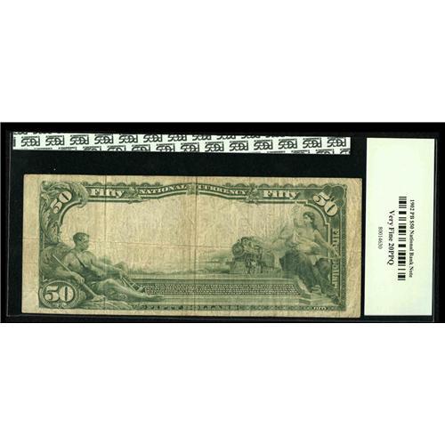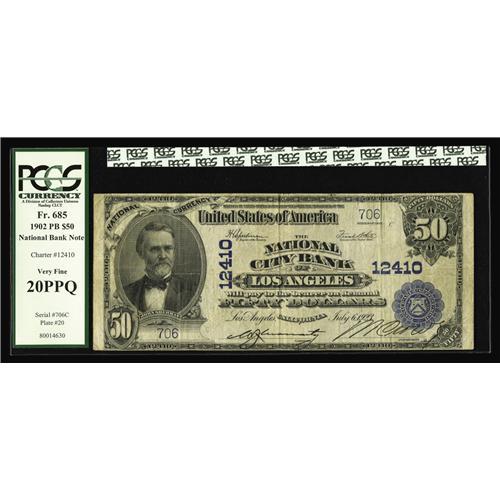 <B>Los Angeles, CA</B></I> - $50 1902 Plain Back Fr. 685 <B>The National City Bank</B></I> Ch. # 12410<BR>This is a new note for the census of only 19 Large for this bank. A.J. Moriarty and M. Crow placed this bank in voluntary liquidation after five years of being in business. <B>Very Fine 20 PPQ.</B></I>