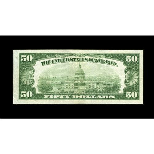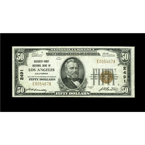 <B>Los Angeles, CA</B></I> - $50 1929 Ty. 1 <B>Security-First NB</B></I> Ch. # 2491<BR>Although this prolific issuer has a considerable census of documented survivors in the normally elusive $50 denomination, tonight's example is an especially attractive <B>Extremely Fine</B></I> likely to sell for no less than...