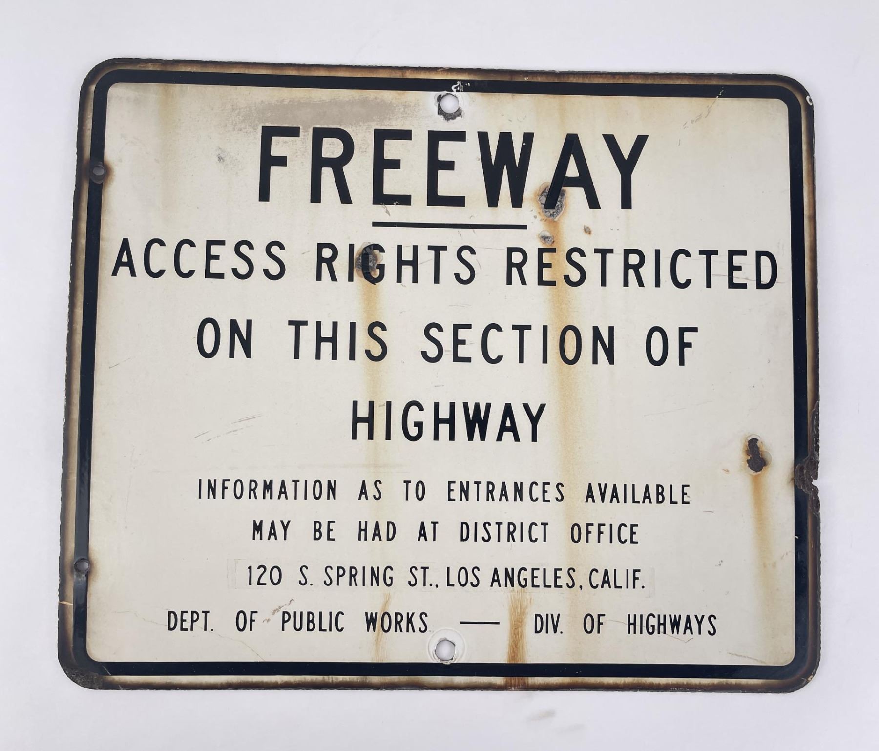 Department of public works Division of Highways Los Angeles California. Nice original porcelain sign. 16" by 19". Has had some paint touchup in the A in Freeway and the G in Rights.