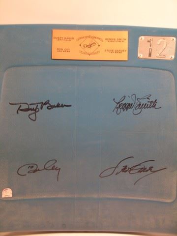 Dodgers Record Setting 30 Homeruns Limited Edition plastic chair back with a plaque on the front and signed by Dusty Baker, Reggie Smith, Ron Cey, and Steve Garvey. Includes the seat number 12. Purchased directly from Dodger Stadium and there are no others available like this with the signatures and seat number available for sale. (approx. 19 1/2" x 17)