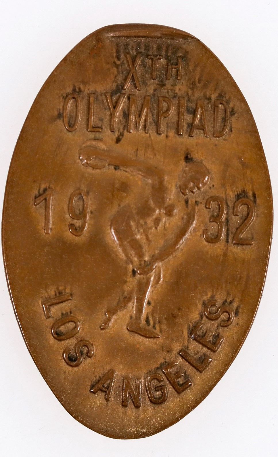 Lincoln cent 1920-S elongated at the Xth Olympics Los Angeles 1932, with discus thrower.