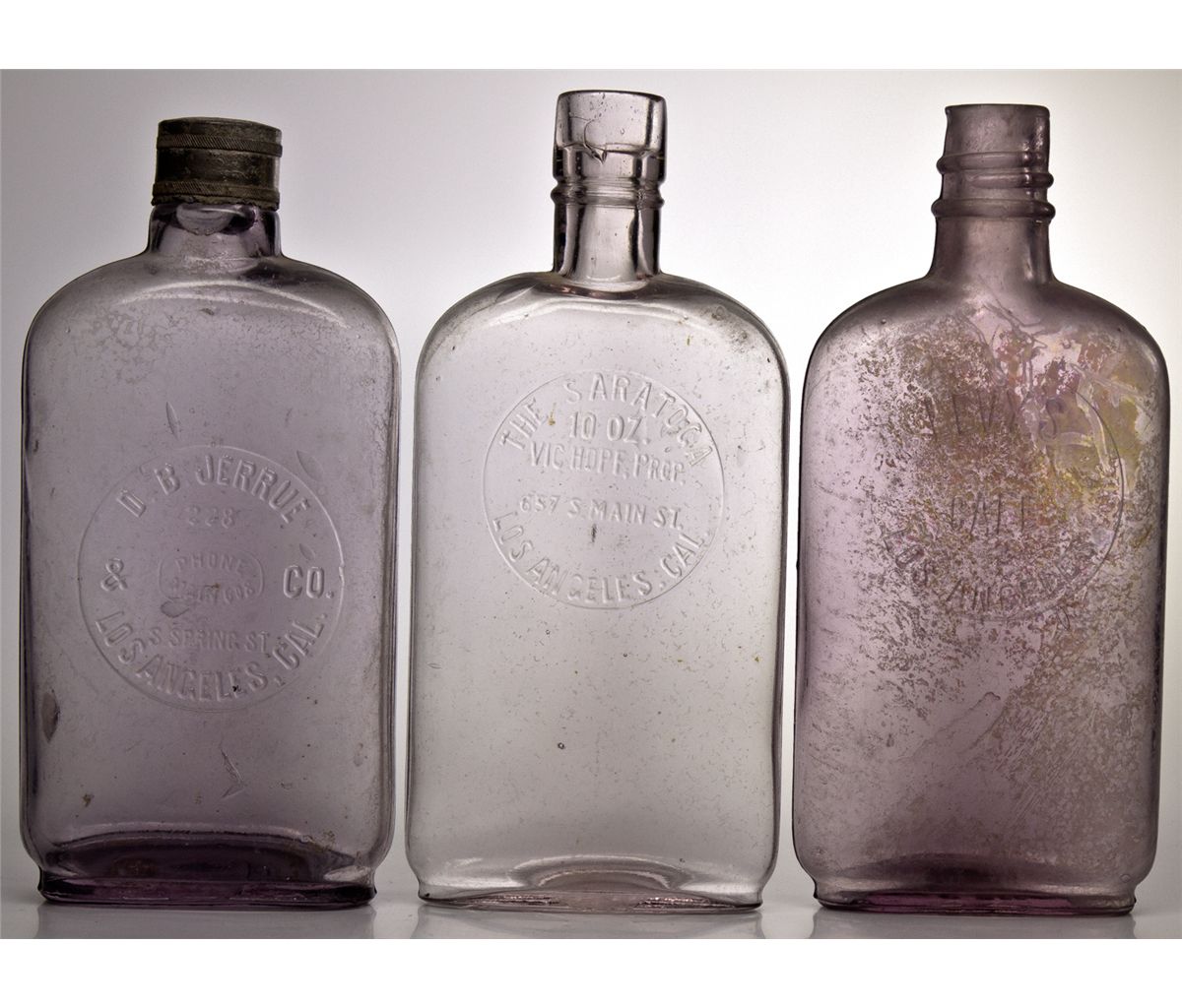 Lot of 3 L.A. area bottles including: 1) A 10 oz. neatly applied top, clear shoo fly flask with knife edge bottom. Inscribed "The Saratoga, 10 oz. Vic Hopf, Prop, 657 So. Main St. Los Angeles Cal." with a hairline crack on the top. Bottle not listed in Wilson. 2) A one pint, outside screw top with cap, ground top shoo fly flask. Bottle has knife edge bottom. Inscribed "J.B. Jarrue & Co., 228 S Spring St. Los Angeles, Cal., Phone Main 608." Small chip at top. Unlisted in Wilson 3) Outside screw top, un-ground, purple sun colored. Slug inscribed "Levy's Café, Los Angeles." Has knife edge bottom and light scratching. The number 1185 embossed on bottom. Un-listed in Wilson or Thomas. Rare. - Feisel Collection -59088