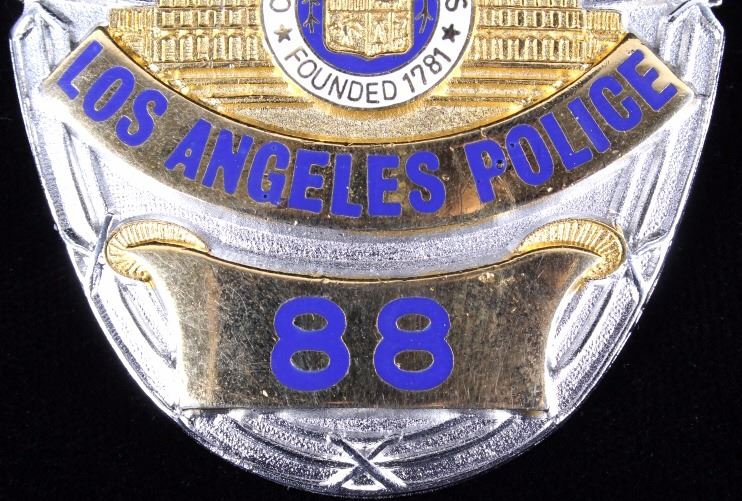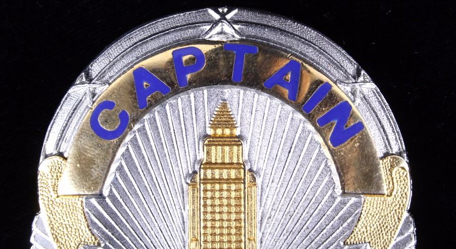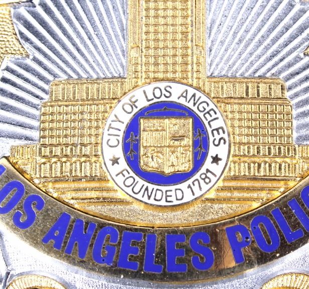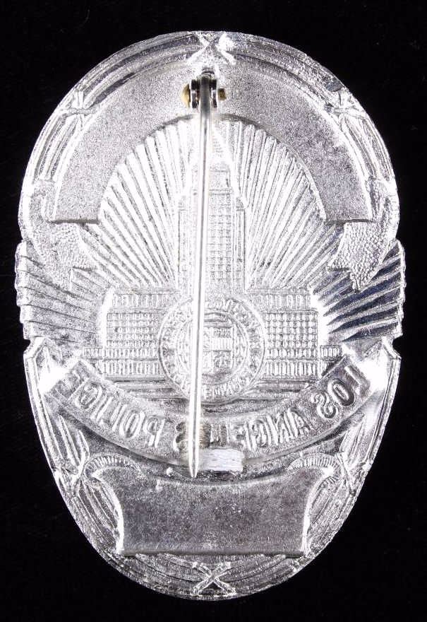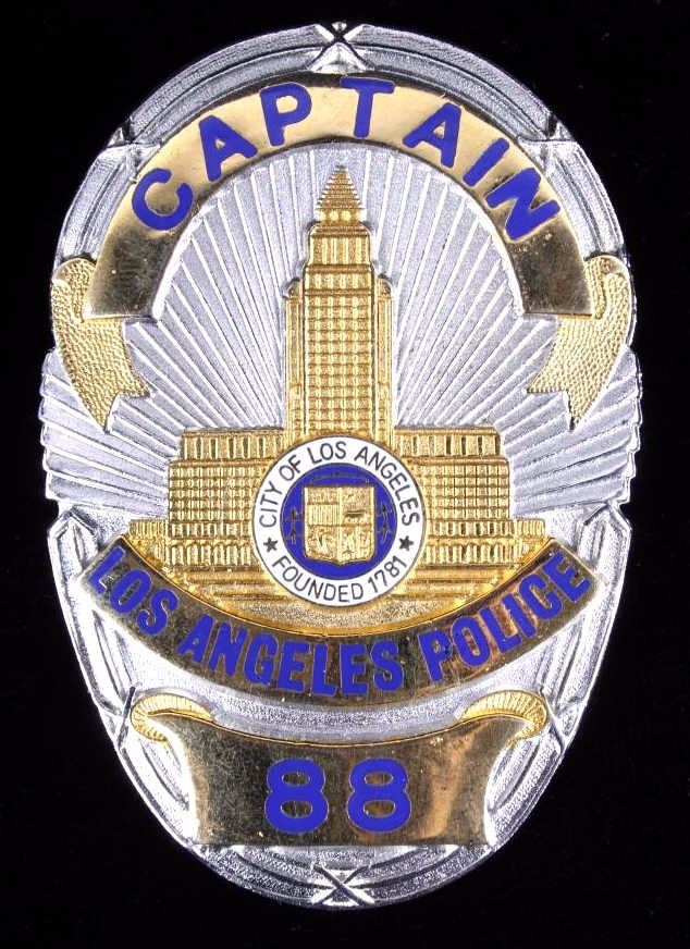 This is a Captain's Los Angeles Police Department metal badge. The LAPD badge shows good condition. It is silver & gold toned with enameled lettering and an enameled Police seal. This has the iconic style from the classic show Dragnet. This is a vintage badge with a embossed back and no hallmark. The movie prop badge has a great iconic look and is a collectible piece. Measures 2 3/8"x3 3/8"