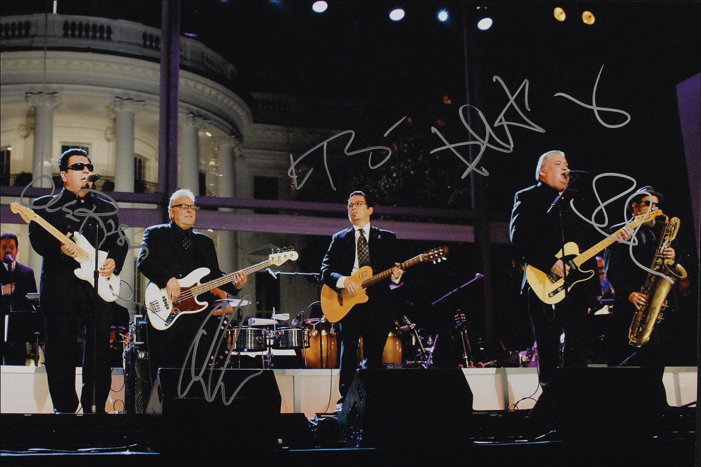 Color satin-finish 18 x 12 photo of the band performing in front of the White House, signed in silver ink by Cesar Rosas, David Hildago, Conrad Lozano, Louie Perez, and Steve Berlin. In fine condition.