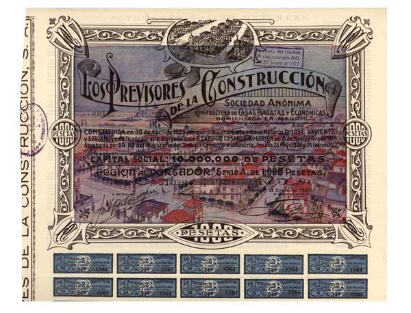 1927, Spain. Stock certificate. A colorful and unique art work over the entire certificate depicting a large panoramic view of the city of Madrid in various colors. Coupons below. Very displayable. Uncancelled and Extremely Fine.