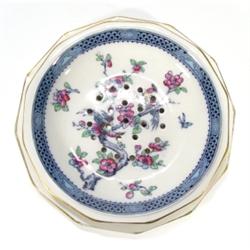 Losolware strainer and base, hand coloured and transfer printed with a bird in a tree, marks to base