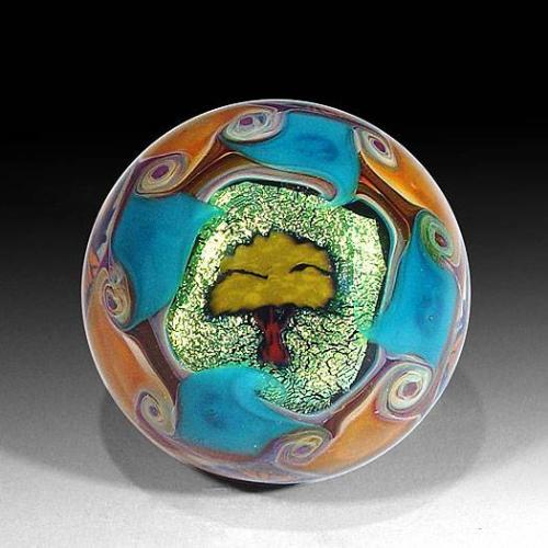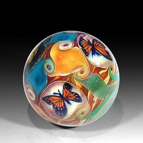 Lost Coast Art Glass 2002 medium marble, with a tree portrait cane on golden dichroic ground, on one side, encircled by swatches of blue and goldenrod, and a spaced ring of monarch butterfly canes, around the exterior. Signed/dated by Taj. Diameter 1 9/16".