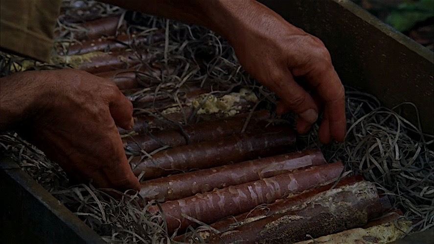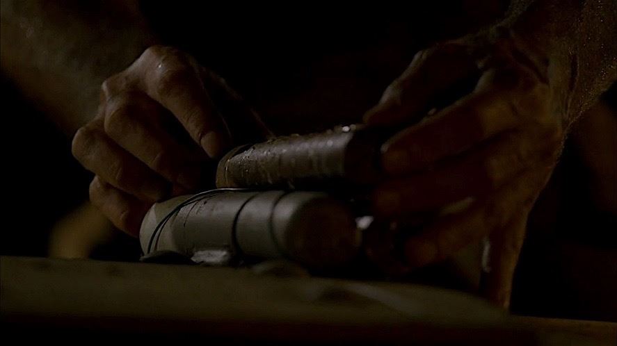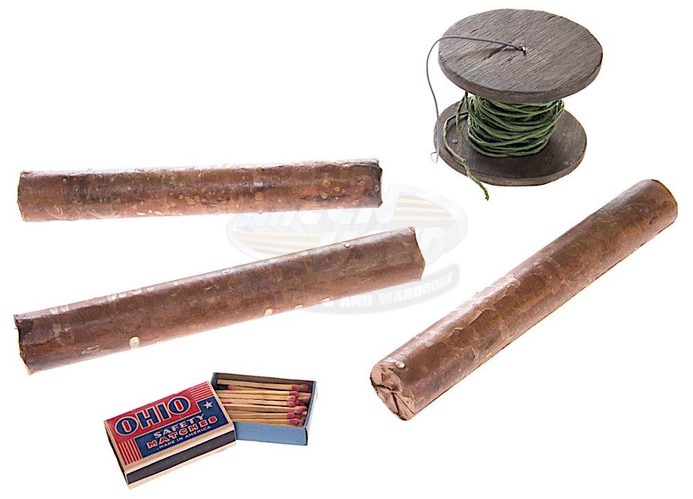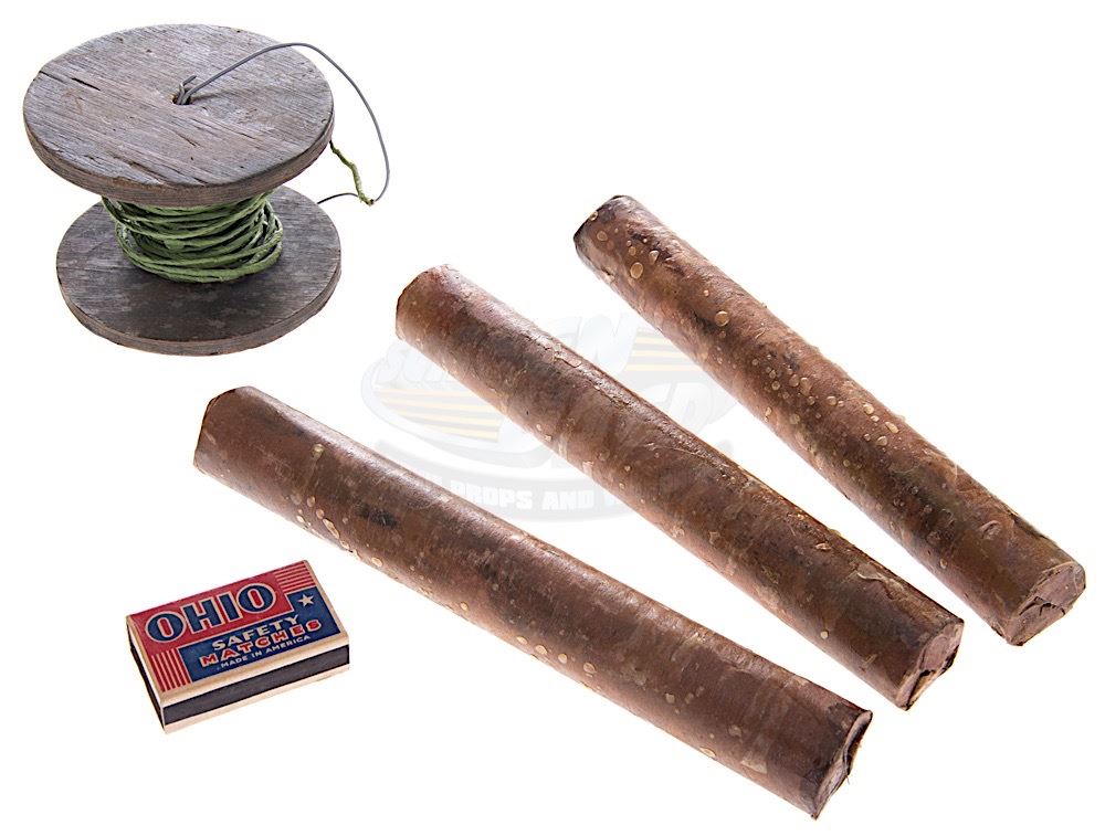 (ABC, 2004-20100 These three sticks of prop dynamite, detonating cord and matches were acquired by the production for use by various actors and as set dressing during filming of the series. The sticks of dynamite appear to be made of wood wrapped in heavy paper and coated, each measures 9.5" in length. The wire cord is wrapped on a wood spool with a metal handle, measures 3.25" x 4.25" in diameter. The box of matches features the "Ohio Safety Matches" branding and measures 2.25" x 1.5" x .75.