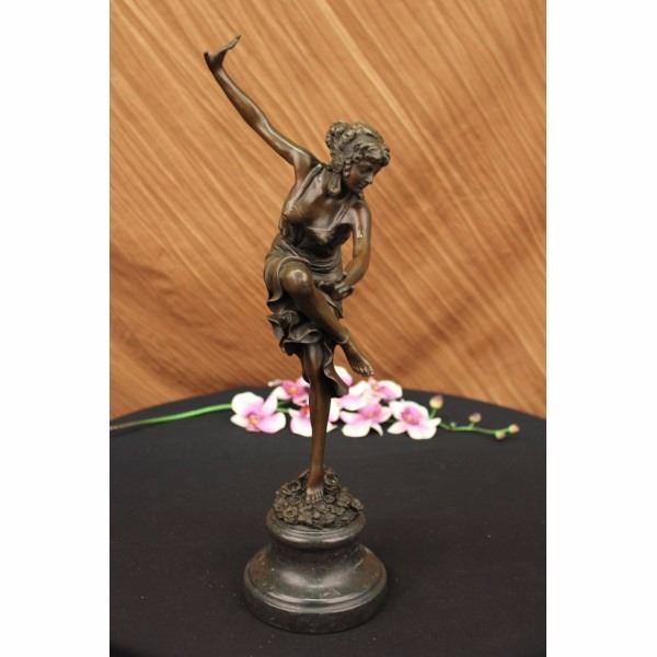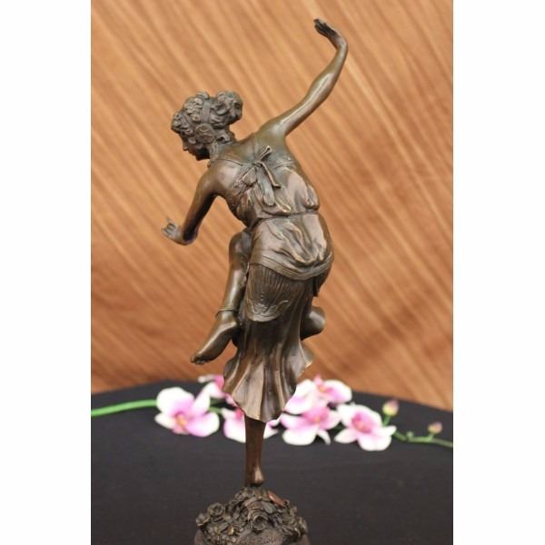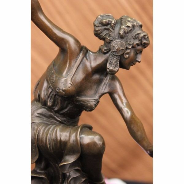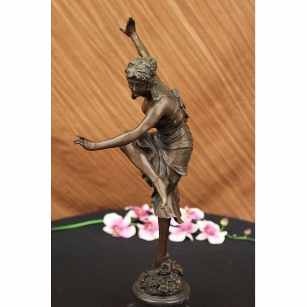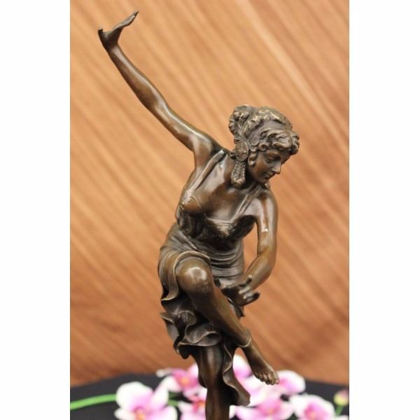 This bronze statue is cast in the traditional lost wax casting process. This insures a quality bronze sculpture that may be passed down from generation to generation. The dancer expands her hands as she gracefully balances on one leg. Her exotic costume is meticulously detailed including her jewelry. Cast from the finest bronze and finished in a rich patina by our talented artisans, this remarkable piece is in superb condition and Mounted on a tiered marble pedestal. Bronze dimensions with marble base: Height 17 X Width 10 inches. Weight: 11 lbs.