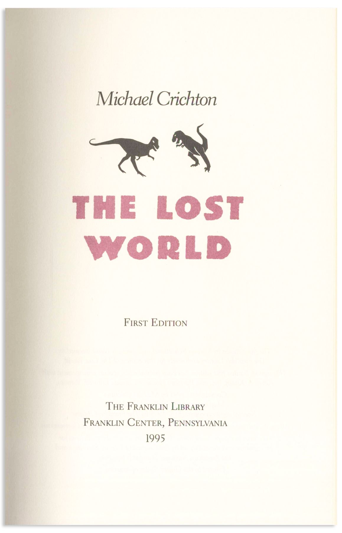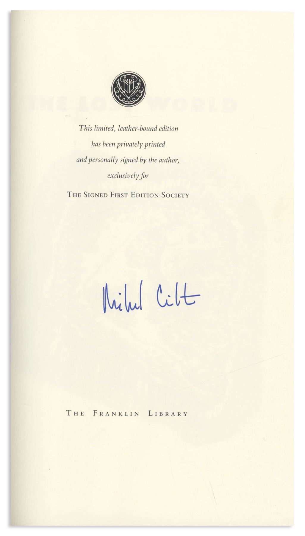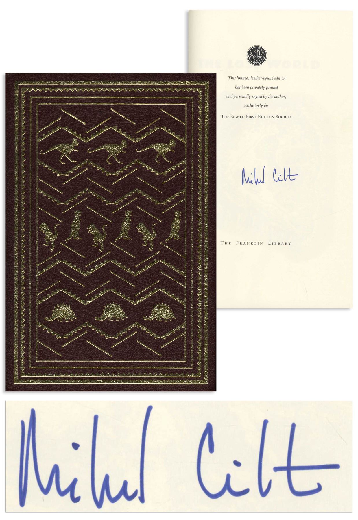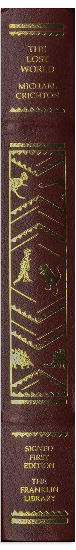 Michael Crichton signed deluxe limited edition of ''The Lost World'', his well-received sequel to ''Jurassic Park''. Franklin Center, PA: Franklin Library, 1995. Signed boldly by Crichton in blue fountain pen on the fly-leaf, book is bound in maroon leather boards with gilt dinosaur illustrations on covers, all edges gilt, decorated endpapers and satin page marker. Measures 6.375'' x 9.625''. Fine condition. With Franklin Library insert and box.