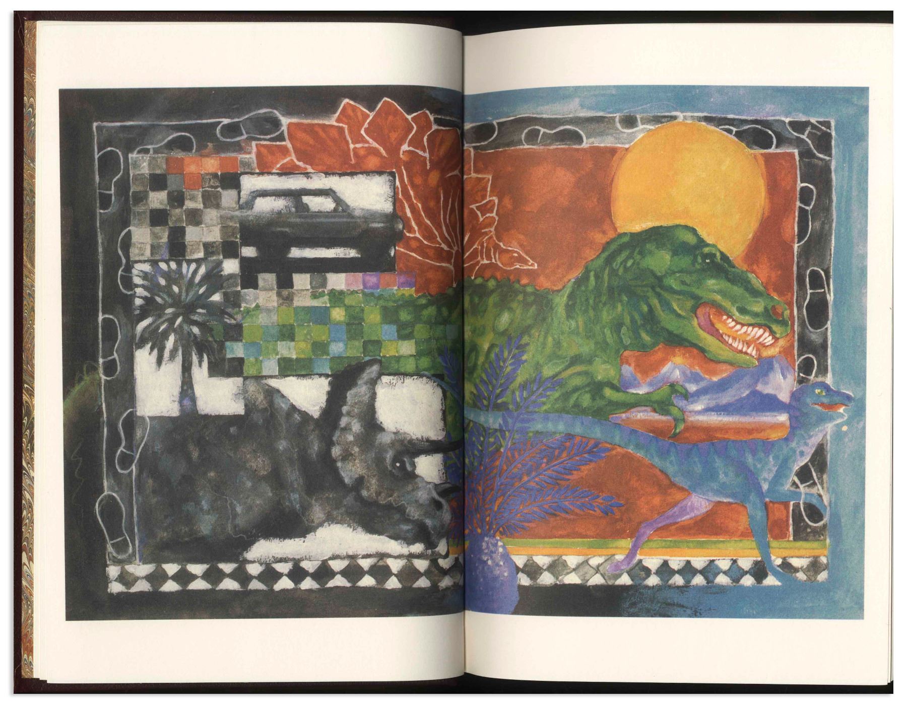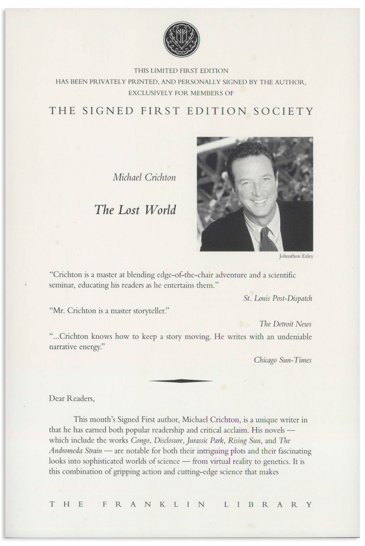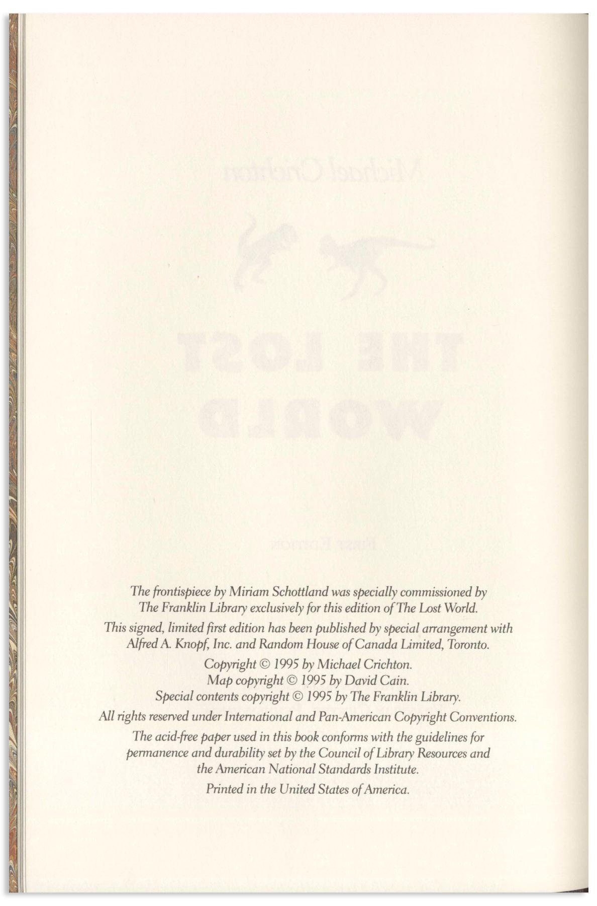 Michael Crichton signed deluxe limited edition of ''The Lost World'', his well-received sequel to ''Jurassic Park''. Franklin Center, PA: Franklin Library, 1995. Signed boldly by Crichton in blue fountain pen on the fly-leaf, book is bound in maroon leather boards with gilt dinosaur illustrations on covers, all edges gilt, decorated endpapers and satin page marker. Measures 6.375'' x 9.625''. Fine condition. With Franklin Library insert and box.