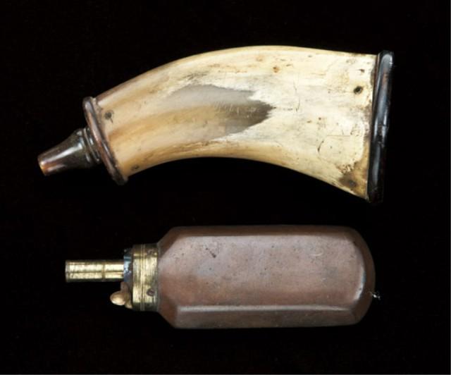 Lost consisting of a turned-horn pistol-size flask, approx. 5-1/2” from tip to end, simple construction, possibly American, early to mid 19th century. Along with a unmarked Sykes style lacquered flask, suitable for dueling pistols. Measuring 4-3/4” spout to end. Spout approx. 1” that would throw a large charge, unmarked, normal aging, bright blue on spring. From the William R. Orbelo Collection. Est: $300 - $600