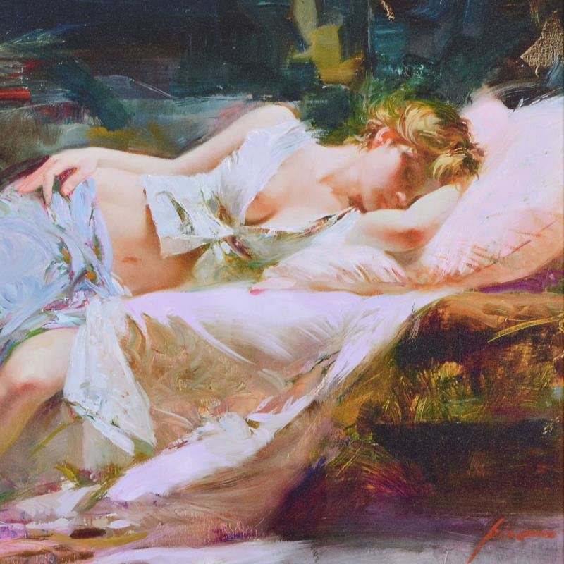 Pino's portraits allow glimpses into intensely personal, intimate spaces, conveying emotion through rich, warm color and sensual brushwork. "Lost in Dreams" is a hand embellished limited edition giclee on canvas by Pino (1939-2010). The piece is numbered, hand signed, custom framed, and includes certificate of authenticity. Measures approx. 51.5" x 35" (frame), 40" x 26" (image). This item requires special handling and may have a longer than usual turnaround.