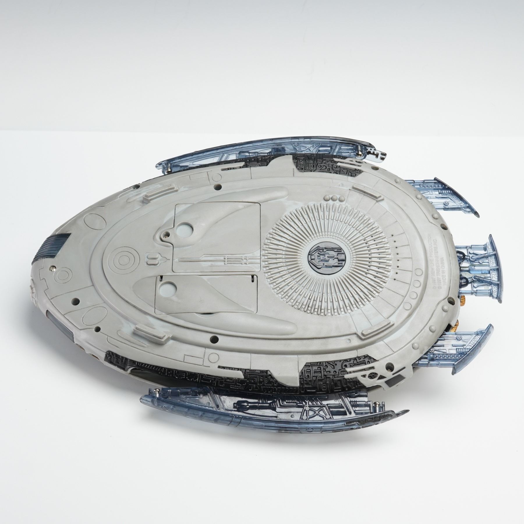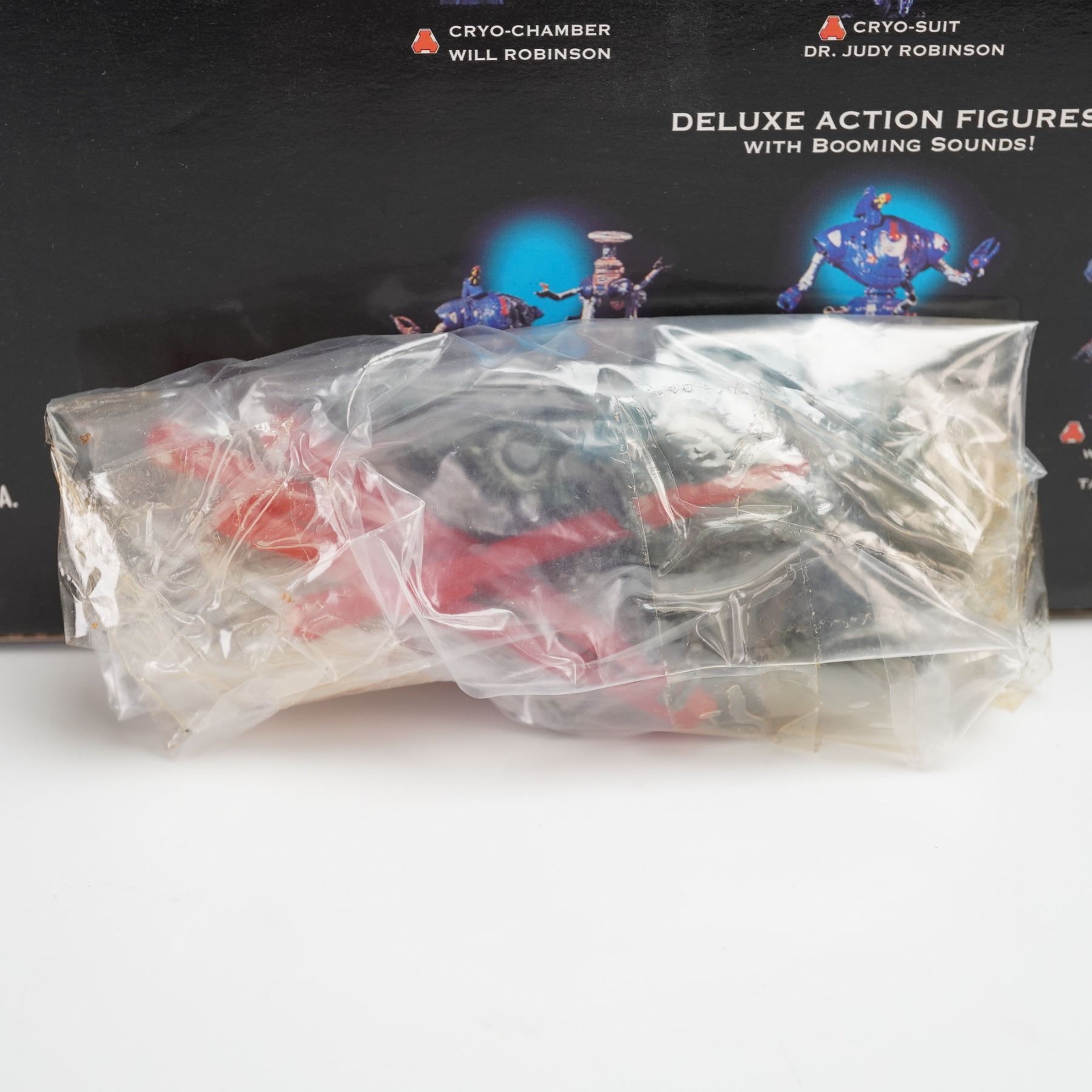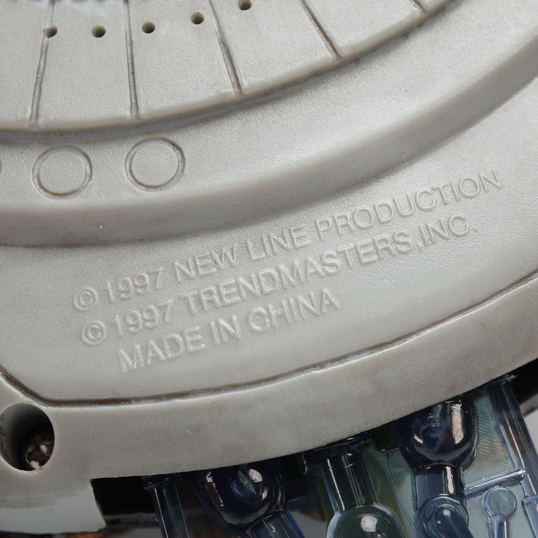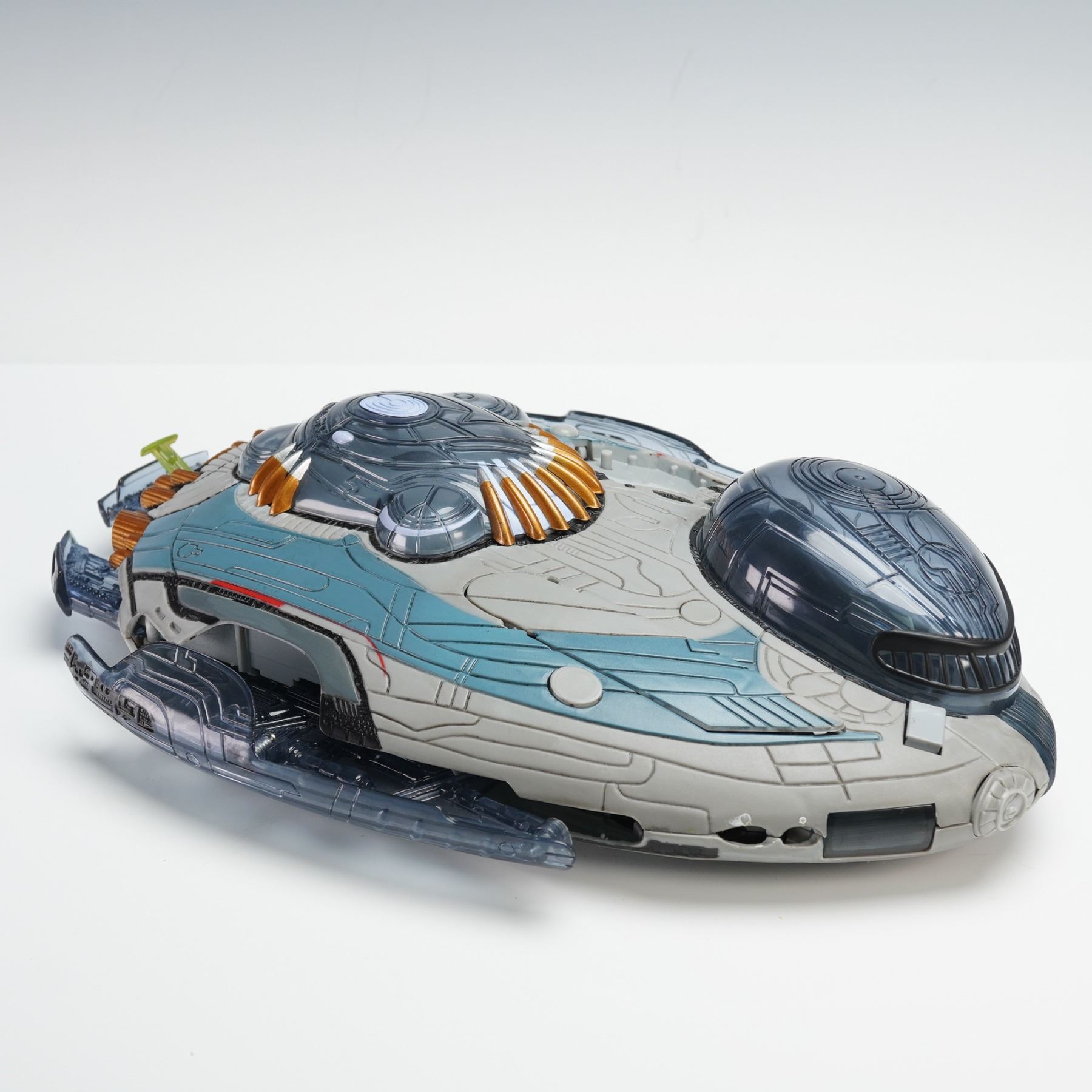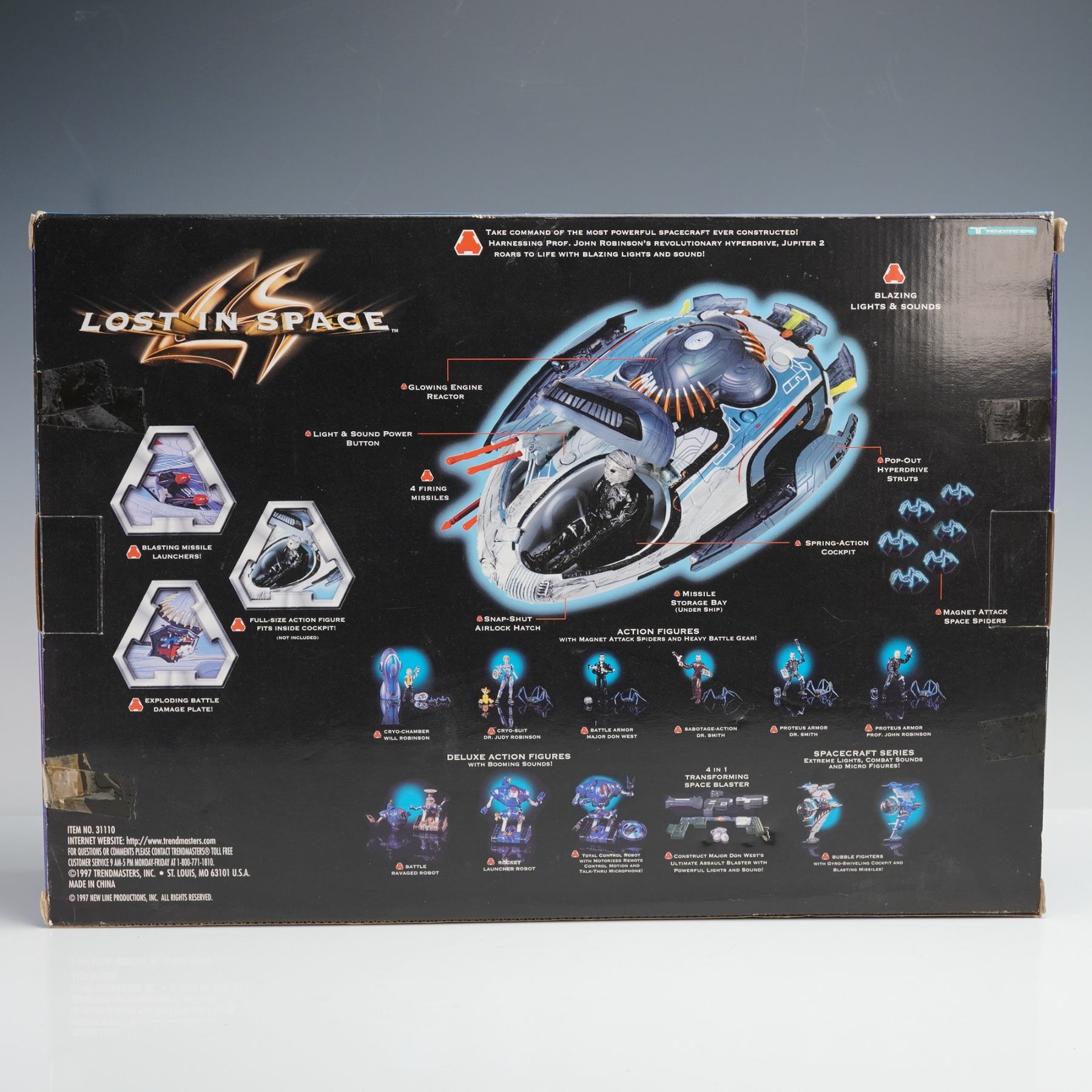 This Lost in Space Jupiter 2 deluxe transforming toy brings the iconic spacecraft from the 1998 film to life. Produced by Trendmasters, this toy features a transforming design with pop-out hyperdrive struts, blasting missile launchers, and a spring-action cockpit. It also includes a glowing engine reactor, adding to the excitement of this collectible. Ideal for fans of the series and collectors of retro sci-fi toys, this Jupiter 2 toy captures the adventure of Lost in Space. This item has its original box.