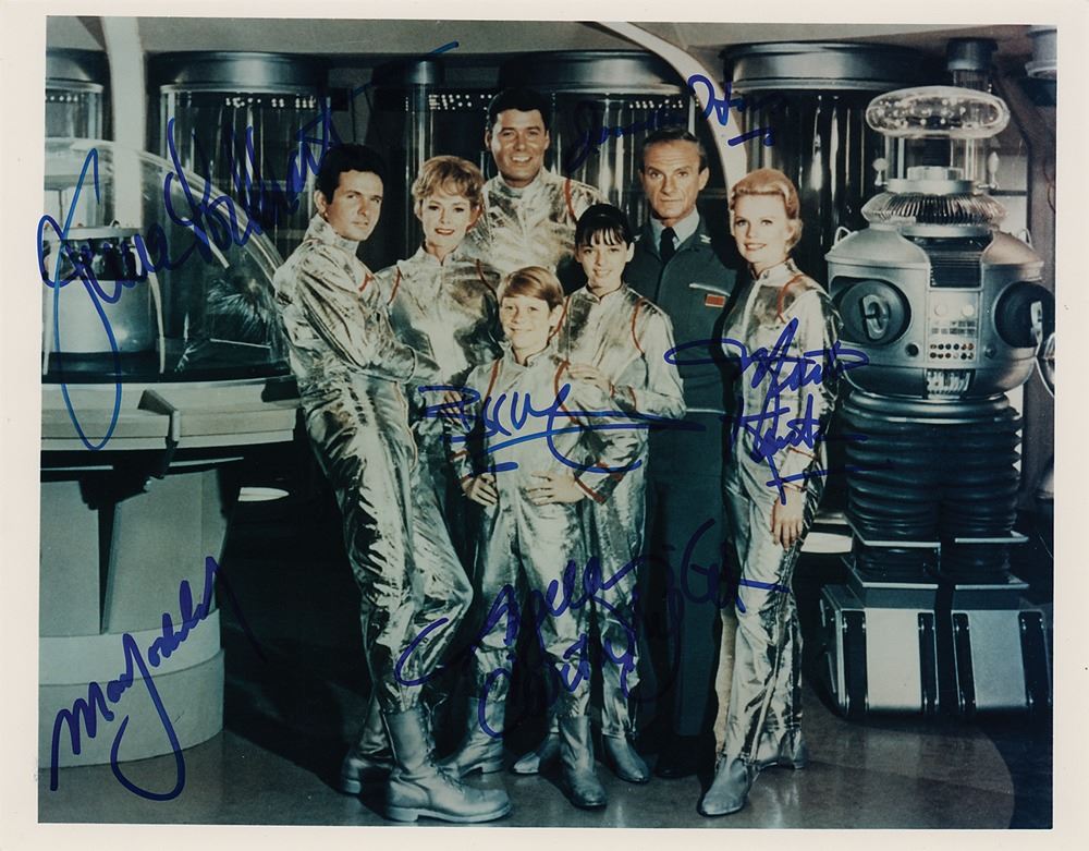 Color glossy 10 x 8 photo of the cast of Lost in Space, signed in blue felt tip by June Lockhart, Mark Goddard, Marta Kristen, Bill Mumy, Angela Cartwright, and Jonathan Harris. In very fine condition. Originally obtained by in-person specialist Mike Wehrmann.