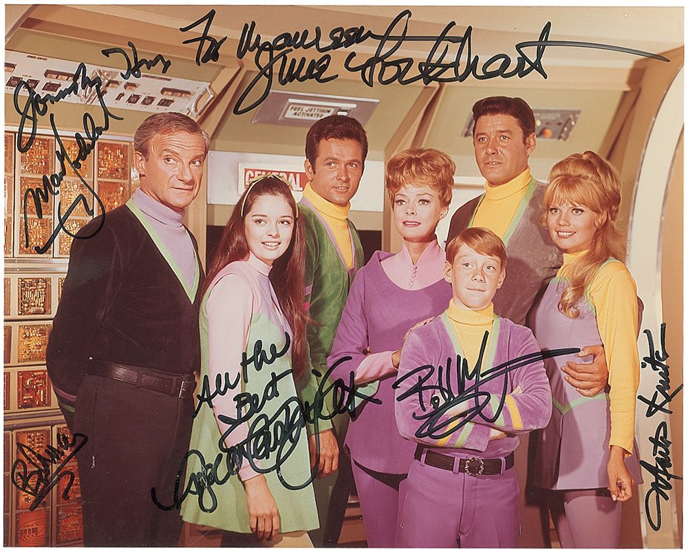 Color glossy 10 x 8 cast photo, signed in-person in black felt tip by June Lockhart (ins), Angela Cartwright, Marta Kristen, Bill Mumy, Mark Goddard, Bob May, and Jonathan Harris. In fine condition, with some mild spotting and rubbing to finish.