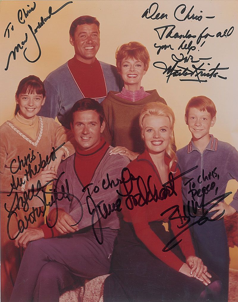 Color glossy 8 x 10 cast photo, signed and inscribed in black felt tip by June Lockhart, Angela Cartwright, Marta Kristen, Bill Mumy, and Mark Goddard. In fine condition.