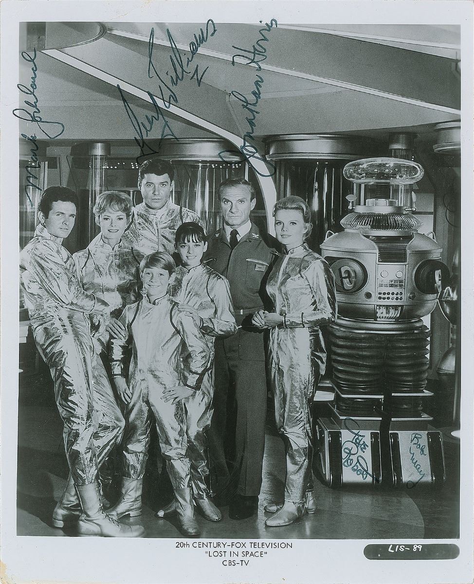 Vintage glossy 8 x 10 20th Century-Fox Television publicity photo of the cast of Lost in Space, signed in black felt tip by Guy Williams, Mark Goddard, Jonathan Harris, and Bob May, who adds “The Robot.” In fine condition, with scattered overall creasing. An exceptional example given that Williams remains scarce in any form, and virtually unobtainable in authentic Lost in Space photos—the additions of Billy Mumy, Angela Cartwright, Marta Kristen, and June Lockhart would make this photo a phenomenal full-cast rarity.