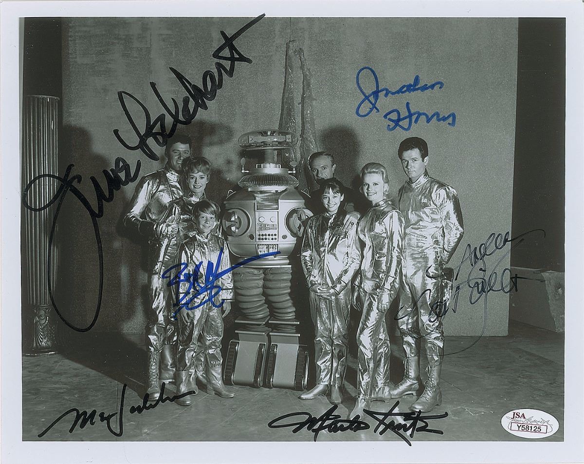 Glossy 10 x 8 photo of the cast of Lost in Space, signed in black or blue felt tip by June Lockhart, Mark Goddard, Marta Kristen, Bill Mumy, Angela Cartwright, and Jonathan Harris. In fine condition. Accompanied by a full letter of authenticity from JSA.