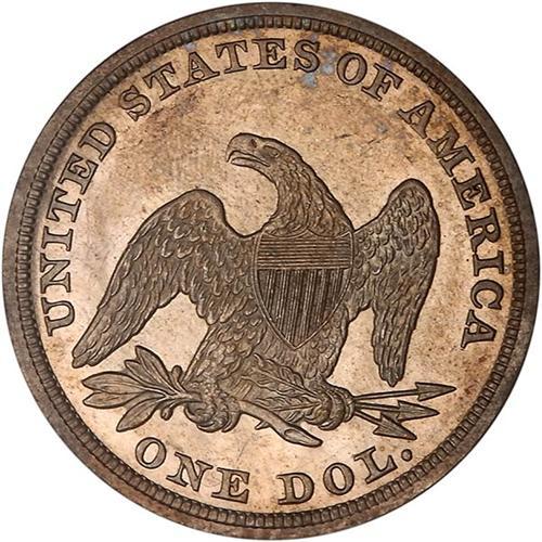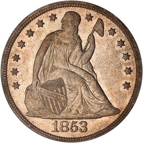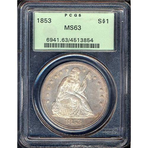 A choice, frosty specimen. Despite the fact that the 1853 is the most commonly seen 1850s silver dollar issue in Mint condition after the 1859-O and 1860-O, it is not often found finer than MS63. Near the high end of the Condition Census, this choice example is among the more attractive No Motto seated dollars of its date that bidders will see offered. Both sides are frosted with delicate natural tinting, the result of long-term storage. What's more, an otherwise sharp strike wanes just a bit over some of the stars, and there are one or two wispy abrasions in the obverse and reverse fields, but we stress that the surfaces are exceptionally choice in overall appearance for an 1853 in this grade.