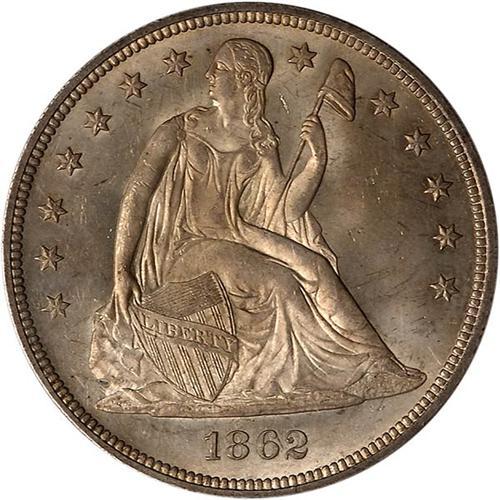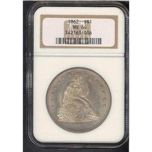 The rarity of this date can be blamed on the Confederate military victories in the latter part of 1861 and on into 1862. The Northern citizenry of the "Union" became concerned about the possibility the war would be lost, and hoarding grew so widespread that coinage of all denominations was withdrawn from the banks. Many silver coins turned up in South or Central America and did not return to American shores until the waning days of the 1870s, years after hostilities ceased. Given these factors, it is no stretch to say that Mint State 1862 dollars are very scarce today. This is one of the few MS64's certified and a coin with a robust set of qualities.