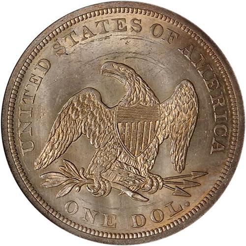 Typical of all 1862 dollars, this piece shows faint die striations in the fields on each side, although not so many as to give the coin a semi-reflective appearance which is the more common appearance of Mint States. The luster is frosty. The striking details are exceptionally bold and enjoyable to examine, there being only the most trivial contact marks noted and these of little consequence. Toned a reddish-brown to light silvery gray across each side, this is an impressive Seated dollar for the grade, one that should fetch a strong price because of the rarity of such pieces in choice Uncirculated condition.