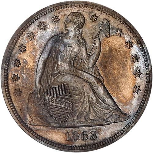 A well toned MS64 of the quality for the grade some collectors admire, but others might turn away from due to the curious distribution of the toning: The luster is still evident throughout, however, and the strike is nearly full, being quite crisp in most places. 1863 is a very scarce year in grades other than Proof, with a mere 27,200 business strikes made, most of which circulated or found their way to Central and South America through export.