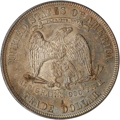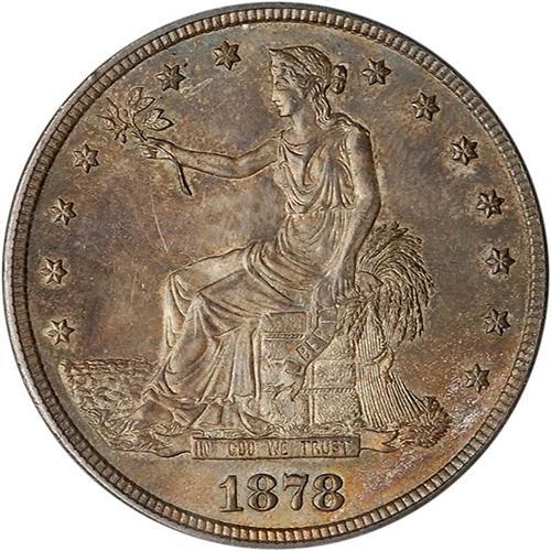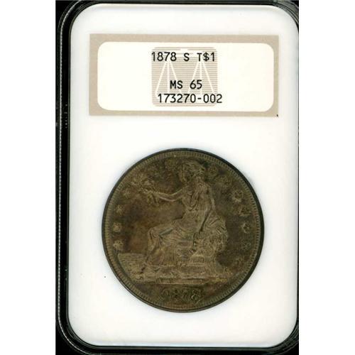 A shimmering, silky-smooth representative with bold definition save for a few isolated areas on the eagle that are affected by less than full strike. The obverse displays wonderful deep golden brown toning at the rims and throughout the fields, leaving Liberty slightly lighter in hue and so somewhat contrasting; the reverse, too, impresses us by its fresh appearance and uncleaned look of more than a century and a quarter of preservation. Despite large scale exportation to the Pacific Rim, the 1878-S was produced in significant enough numbers (over 4.162 million pieces) to ensure its status as one of the more plentiful Trade Dollar issues at the Mint State level. That said, the number of survivors in Gem condition is extremely small.