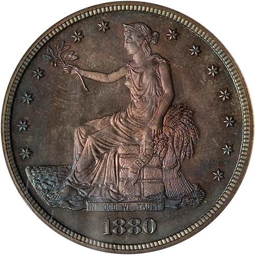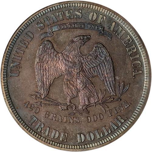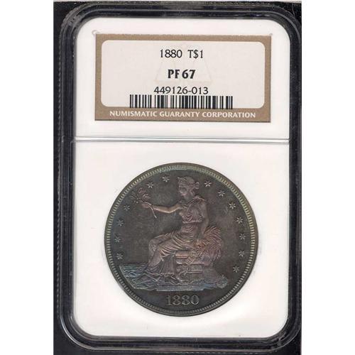 Superb! And a visual treat with outstanding purple-gray to iridescent steel blue surfaces on the obverse, and the same sort of natural iridescent toning throughout the reverse; a coin that is simply magnificent! Few similarly toned Trade dollars exist with such original splashes of color and glowing mirrors. In fact, the coin is <I>deeply mirrored<I> with frosted devices rising up from the smooth background. This gives the coin its cameo quality. This coin <I>defines<I> what it is to be Proof 67 and have earned the coveted grade from NGC.