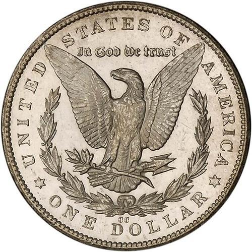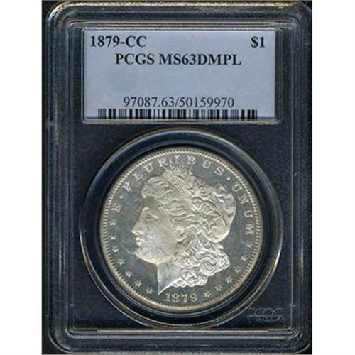 All but unobtainable finer as a deep mirror coin, the 1879-CC Morgan dollar with normal mintmark (as opposed to the capped mintmark variety) is an elusive issue in better Mint State grades. Usually frosty, the specimen that we offer here displays ice-white devices that are free of all but the most trivial bagmarks, surrounded by pools of mirror reflection. The otherwise strong strike wanes only slightly over the central obverse, but the overall eye appeal is undiminished. There are the usual small scuffs in the frost of the face, but the portrait remain true-to-form by being nicely frosted. It seems that the few prooflikes each year arise from first-strikes off of new dies. With constant pounding as the production run continues, the mirror polish on the dies abrades to fine flow-lines that create the familiar lustrous or frosty appearance seen on most. Struck on the mint's largest coining presses, silver dollars in 1879 were struck at the rate of about 90 coins per minute with a force equalling 160 to 175 tons per square inch (40 tons of force was required to strike an Indian cent).