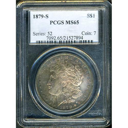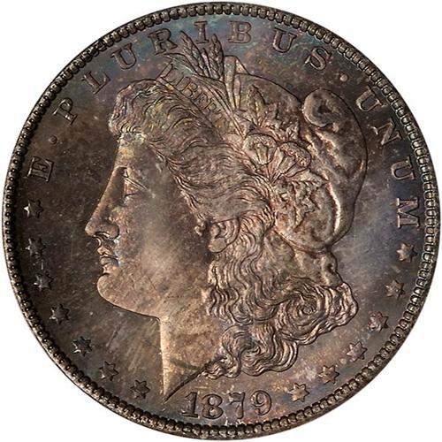 A glistening beauty and a gem by any standards. An engaging display of lively toning iridescence leaps across the highly lustrous silver gray surfaces of this plentiful but still desirable branch mint gem. The strike is strong for the 1879-S issue as well.