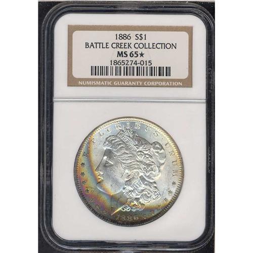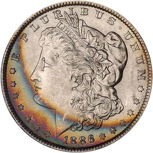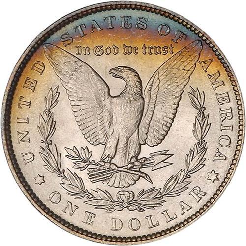Here, too, the bands of toning are delectible as they stretch inward from the rims toward the center, but still leave enough pure white radiance on the obverse for everyone to admire; the reverse is completely brilliant.